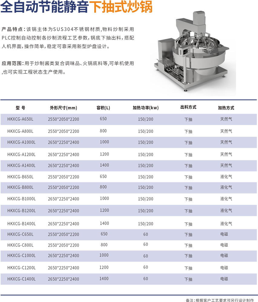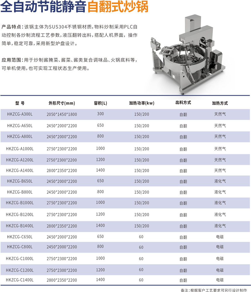 該鍋主體為SUS304不銹鋼材質,物料炒制采?PLC?動控制各炒制流程?藝參數(shù),液壓翻轉出料,搭配?機界?, 操作簡單,穩(wěn)定可靠,采?新型爐盤設計。