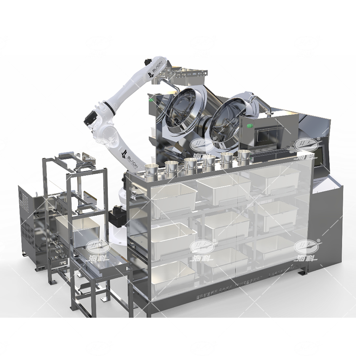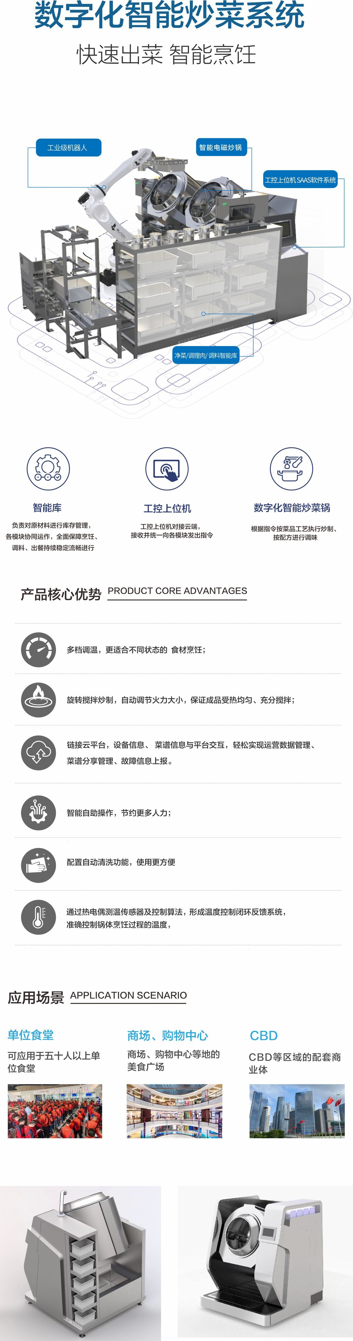 可用于集體用餐的食堂(機(jī)關(guān)、院校、工廠、中央廚房配餐中心等大型食堂)等場(chǎng)景量身打造的烹飪系統(tǒng),主要由空盆/成品智能庫(kù)、凈菜/調(diào)理肉/調(diào)料智能庫(kù)、工控上位機(jī)SaaS軟件系統(tǒng)、數(shù)字化智能炒菜鍋以及工業(yè)級(jí)機(jī)器人組成,工控上位機(jī)對(duì)接云端,接收并統(tǒng)一向各模塊發(fā)出指令。